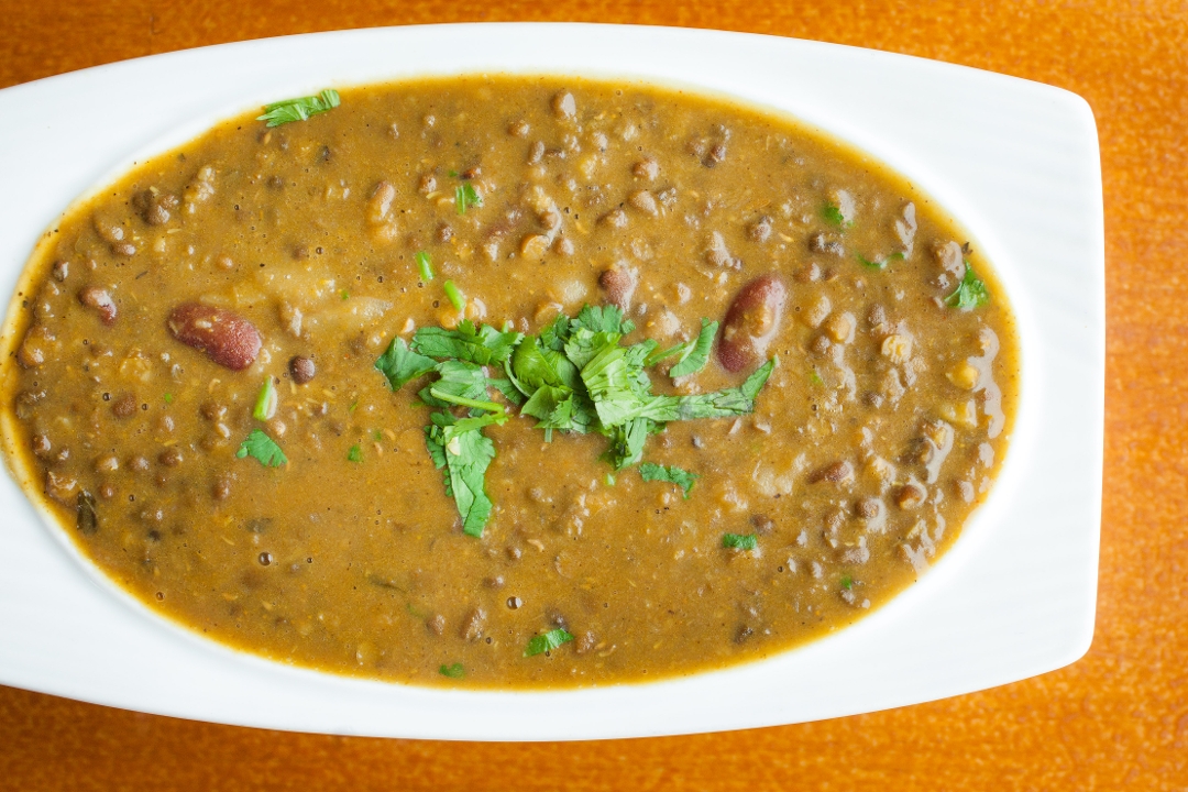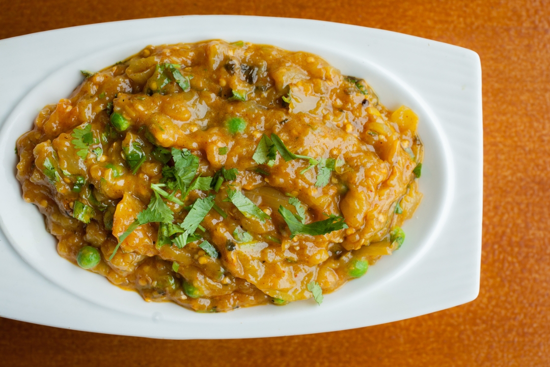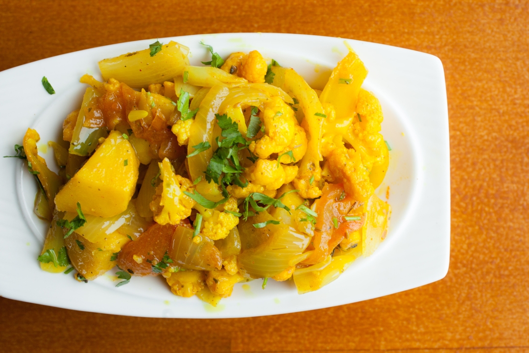 A traditional brown curry prepared with tomatoes, onions, fresh vegetables and fresh herbs.