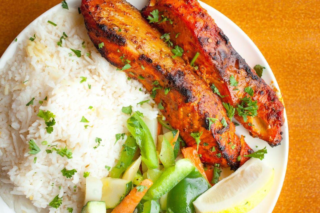 Savory marinated salmon with saffron, garlic, ginger, and a special blend of spices roasted in the tandoor.Served with basmati rice, fresh sauteed vegetables, and famous cilantro and tamarind chutneys.
