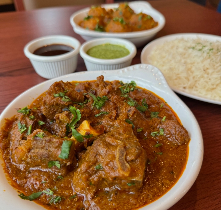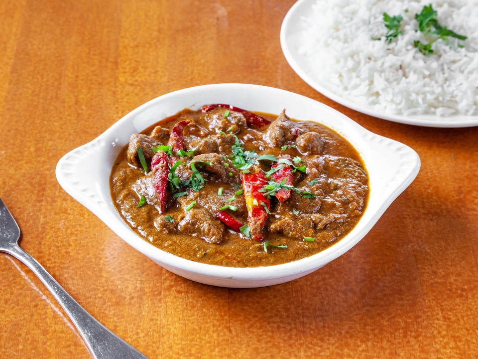 A full lunch portion of our Kashmiri Rogan Josh, served with basmati rice, a warm naan.