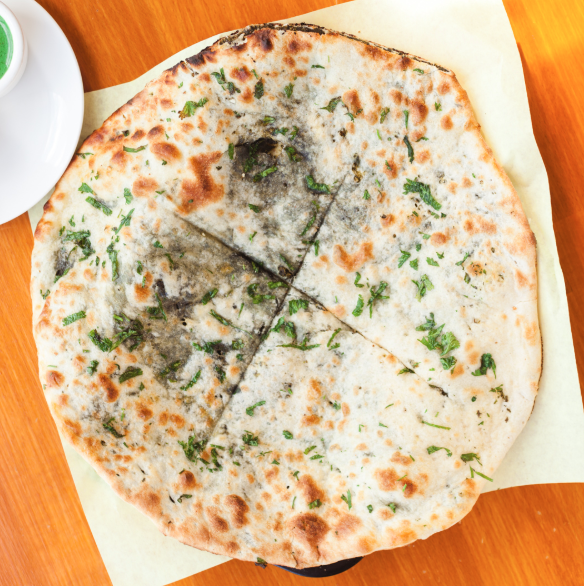 Leavened bread stuffed with traditional Indian homemade cheese.