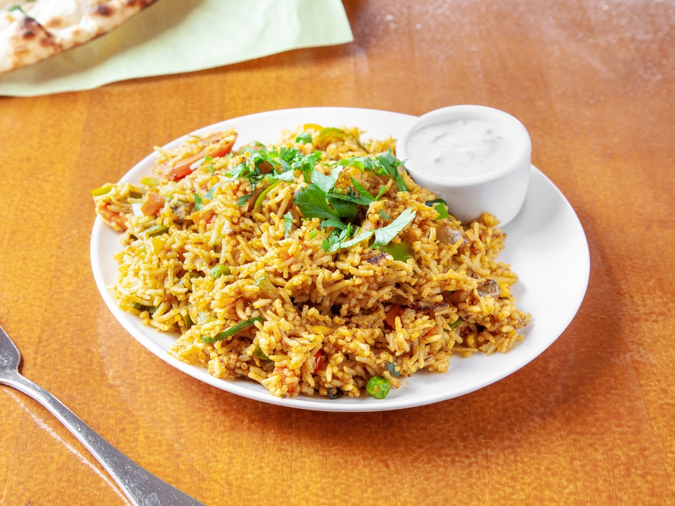 A classical Mughlai dish cooked with fresh vegetables, curry, basmati rice, cashew nuts, and saffron.