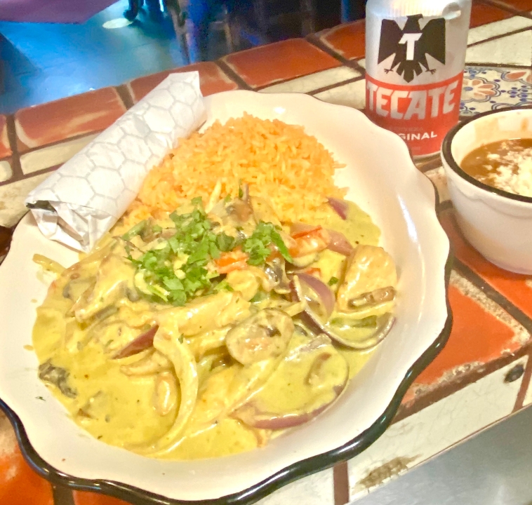 Sautéed chicken breast, peppers and onions, poblano cream sauce, rice and borracho beans, flour tortillas to roll your own.